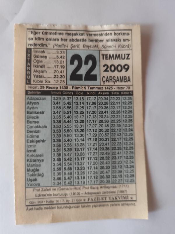 22 Temmuz 2009-Orijinal Takvim Yaprağı-Doğum Günü-Söz,Nişan,Nikâh,Düğün ve Önemli Günler Hediyesi-Fazilet Takvimi-Ayet(Hadis)(Hadis-i Şerif, Sünen-i Kübra)-Prut Zaferi Ve Prut Barış Antlaşması (1711)-Şaban-ı Şerif-Misvak, en son 2 saat önce güncellenmiştir.