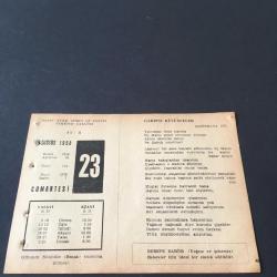 23 AĞUSTOS 1958 -TAKVİM YAPRAĞI-DOĞUM GÜNÜ HEDİYESİ-AJANS-TÜRK ŞİİRLİ VE SAATLİ TÜRKİYE TAKVİMİ,ŞAHİNKAYA DİL,FAL,FIKRA,ÇALDIRAN ZAFERİ,1514,SAKARYA MEYDAN MUHARABESİ 1921,GÜZEL SÖZ,YEMEK LİSTESİ başlıklı ürün, Efemera, Müzik, Sinema > Belge ve Evraklar > Takvimler kategorisi altında İkinci El olarak satılmaktadır.