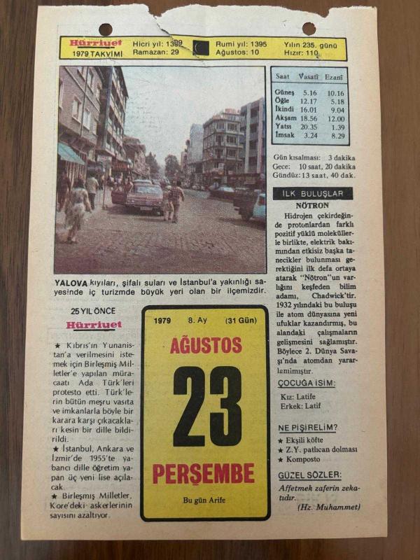 23 AĞUSTOS 1979 - TAKVİM YAPRAĞI - DOĞUM GÜNÜ HEDİYESİ - HÜRRİYET TAKVİMİ - PİS BİR İŞ ROMANI - Genelkurmay eski başkanlarından Orgeneral Faruk Gürler'in ölümü (1975) - Şeyhülislam Ebusuut Efendi'nin ölümü (1574) - Yavuz Sultan Selim'in Çaldıran zaferi (1514), en son 8 ay önce güncellenmiştir.