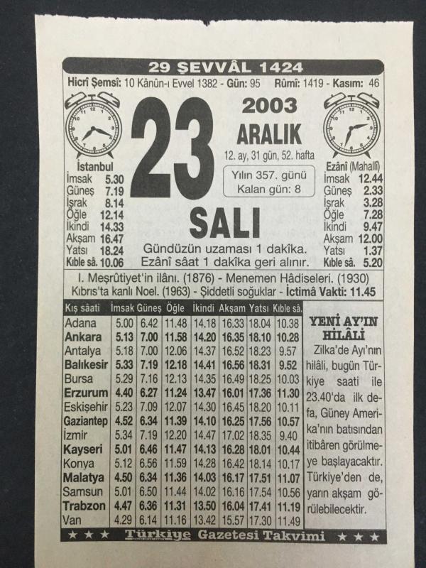 23 ARALIK 2003-TAKVİM YAPRAĞI-DOĞUM GÜNÜ HEDİYESİ-TÜRKİYE GAZETESİ TAKVİMİ,1.MEŞRUİYETİN İLANI 1876,MENEMEN HADİSELERİ 1930,KIBRISTA KANLI NOEL,1963,ŞİDDETLİ SOĞUKLAR,İMAM I MUHAMMED, en son 8 ay önce güncellenmiştir.