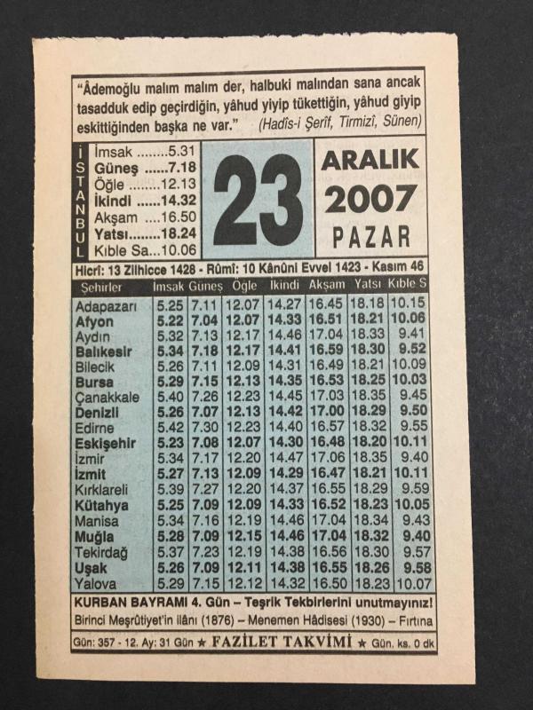 23 ARALIK 2007 -TAKVİM YAPRAĞI-DOĞUM GÜNÜ HEDİYESİ-FAZİLET TAKVİMİ,KURBAN BAYRAMI 4.GÜN,1.MEŞRUTİYETİN İLANI 1876,MENEMEN HADİSESİ 1930,RESULÜ EKREMİN BAZI AZADLILARI,