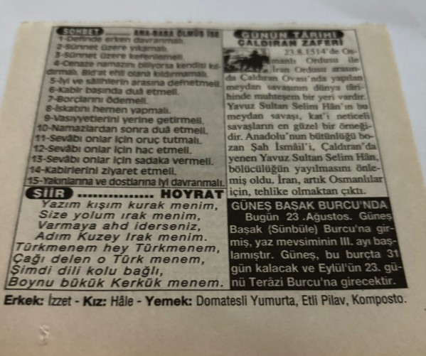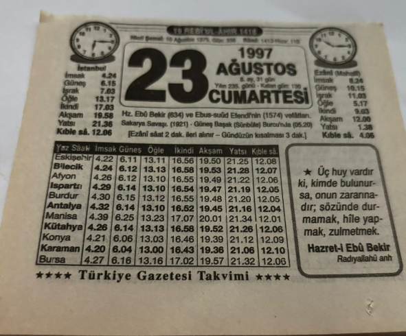 23 Ağustos 1997-Orijinal Takvim Yaprağı-Doğum Günü-Söz,Nişan,Nikâh,Düğün ve Önemli Günler Hediyesi-Türkiye Gazetesi Takvimi-Ayet,Hadis (Hazret-i Ebu Bekir)-Sakarya Savaşı(1921)-Ana Baba Ölmüş İse-Çaldıran Zaferi-Hoyrat-Erkek:İzzet,Kız:Hale, en son 2 gün önce güncellenmiştir.