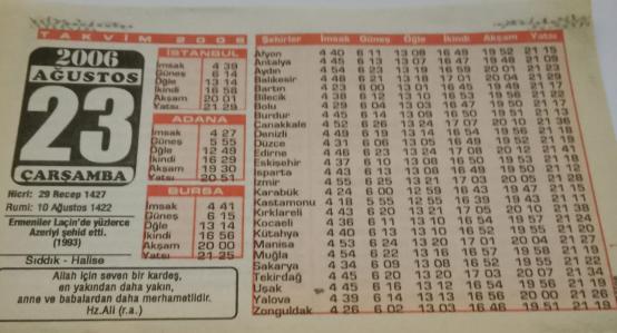 23 Ağustos 2006-Orijinal Takvim Yaprağı-Doğum Günü-Söz,Nişan,Nikâh,Düğün ve Önemli Günler Hediyesi-Bizim Anadolu Takvimleri-Ayet(Hz.Ali(r.a.))-Ermeniler Laçin'de yüzlerce Azeriyi şehid etti(1993)-Sıddık,Halise-Küfre Götüren Yollar-I, en son 2 ay önce güncellenmiştir.