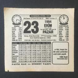 23 EKİM 1994 -TAKVİM YAPRAĞI-DOĞUM GÜNÜ HEDİYESİ-FATİH HAK VE HİZMET VAKFI TAKVİMİ,GÜNEŞ AKREP BURCUNDA,PTT NİN KURULUŞU 1840,KIRIM HARBİNİN BAŞLAMASI 1853,DENİZDE AKŞAM,, en son 8 ay önce güncellenmiştir.