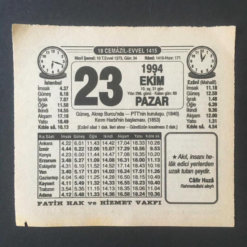 23 EKİM 1994 -TAKVİM YAPRAĞI-DOĞUM GÜNÜ HEDİYESİ-FATİH HAK VE HİZMET VAKFI TAKVİMİ,GÜNEŞ AKREP BURCUNDA,PTT NİN KURULUŞU 1840,KIRIM HARBİNİN BAŞLAMASI 1853,DENİZDE AKŞAM, başlıklı ürün, Efemera, Müzik, Sinema > Belge ve Evraklar > Takvimler kategorisi altında İkinci El olarak satılmaktadır.