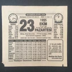 23 EKİM 1995 -TAKVİM YAPRAĞI-DOĞUM GÜNÜ HEDİYESİ-TÜRKİYE GAZETESİ TAKVİMİ,GÜNEŞ AKREP BURCUNDA,PTT NİN KURULUŞU 1840,KIRIM HARBİNİN BAŞLAMASI 1853,SULTAN VAHİDEDDİN başlıklı ürün, Efemera, Müzik, Sinema > Belge ve Evraklar > Takvimler kategorisi altında İkinci El olarak satılmaktadır.