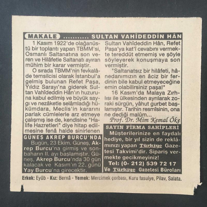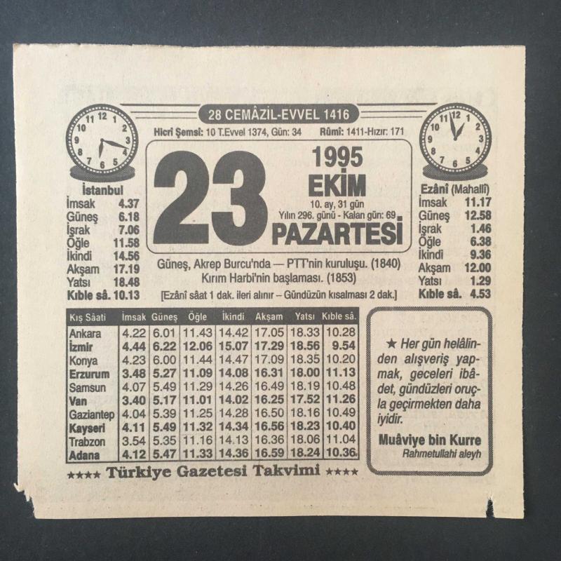 23 EKİM 1995 -TAKVİM YAPRAĞI-DOĞUM GÜNÜ HEDİYESİ-TÜRKİYE GAZETESİ TAKVİMİ,GÜNEŞ AKREP BURCUNDA,PTT NİN KURULUŞU 1840,KIRIM HARBİNİN BAŞLAMASI 1853,SULTAN VAHİDEDDİN, en son 8 ay önce güncellenmiştir.