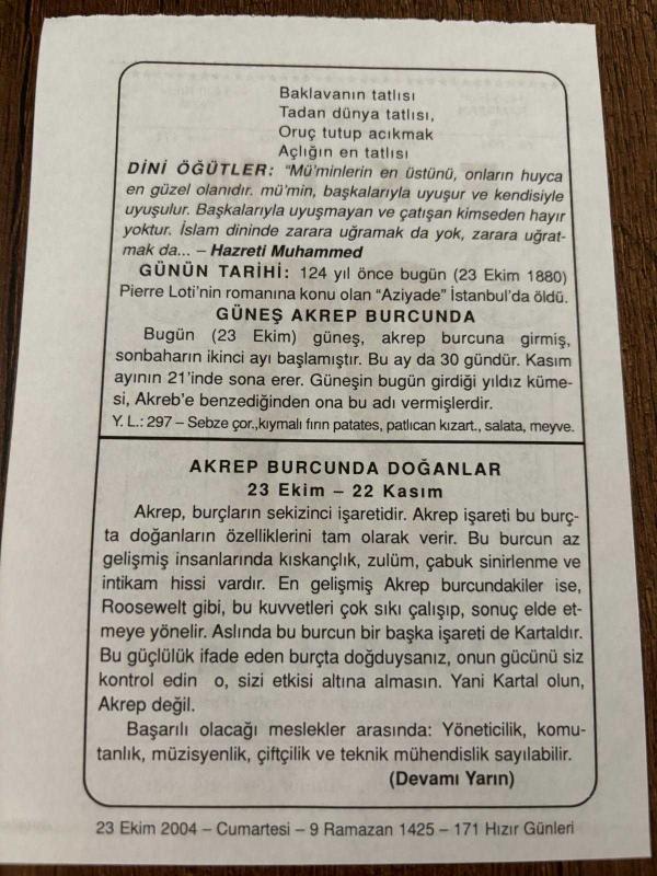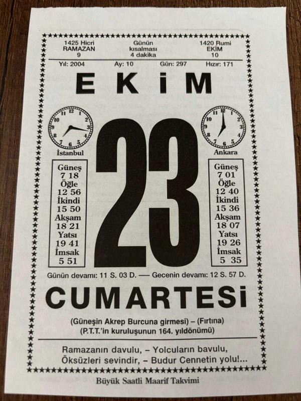 23 EKİM 2004 - TAKVİM YAPRAĞI - DOĞUM GÜNÜ HEDİYESİ - BÜYÜK SAATLİ MAARİF TAKVİMİ - HZ.MUHAMMED - PİERRE LOTİ ROMANINA KONU OLAN AZİYADE ÖLDÜ - GÜNEŞ AKREP BURCUNDA - AKREP BURCUNDA DOĞANLAR, en son 8 ay önce güncellenmiştir.