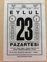 23 EYLÜL 2002 - TAKVİM YAPRAĞI - DOĞUM GÜNÜ HEDİYESİ - BÜYÜK SAATLİ MAARİF TAKVİMİ - BYRON - HİCRİ ŞEMSİ YILBAŞI - SONBAHAR FASLI VE GÜNEŞ TERAZİ BURCUNDA - TERAZİ BURCUNDA DOĞANLAR başlıklı ürün, Efemera, Müzik, Sinema > Belge ve Evraklar > Takvimler kategorisi altında İkinci El olarak satılmaktadır.