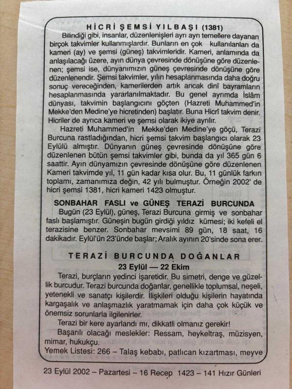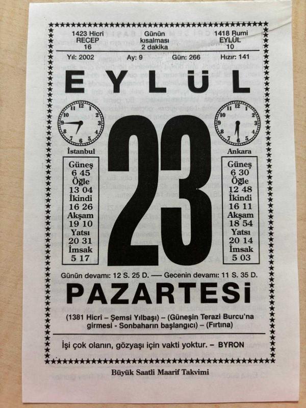 23 EYLÜL 2002 - TAKVİM YAPRAĞI - DOĞUM GÜNÜ HEDİYESİ - BÜYÜK SAATLİ MAARİF TAKVİMİ - BYRON - HİCRİ ŞEMSİ YILBAŞI - SONBAHAR FASLI VE GÜNEŞ TERAZİ BURCUNDA - TERAZİ BURCUNDA DOĞANLAR, en son 8 ay önce güncellenmiştir.