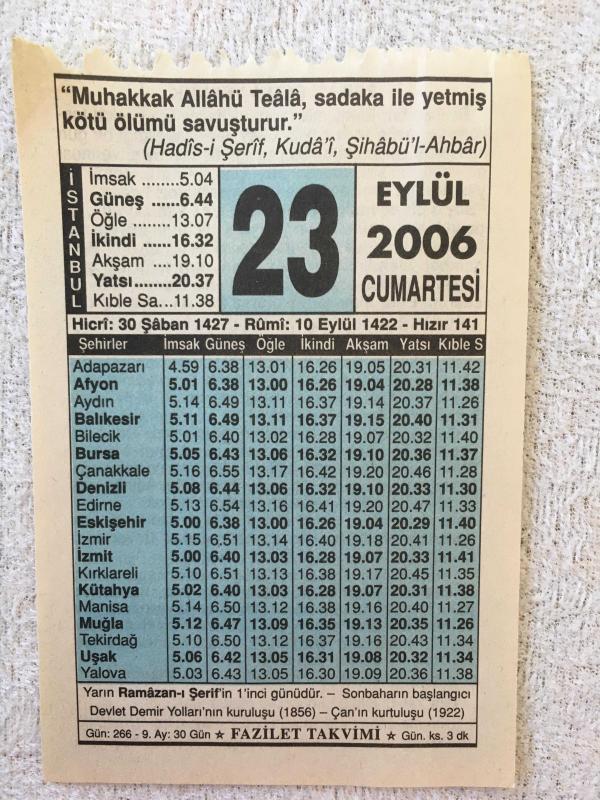 23 EYLÜL 2006-TAKVİM YAPRAĞI-DOĞUM GÜNÜ HEDİYESİ-FAZİLET TAKVİMİ, 1 yıl önce satışa sunulmuştur.