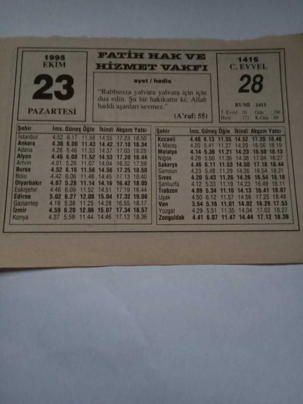 23 Ekim 1995-Orijinal Takvim Yaprağı-Doğum Günü-Söz,Nişan,Nikâh,Düğün ve Önemli Günler Hediyesi-Fatih Hak ve Hizmet Vakfı-Ayet/Hadis(A'raf:55)-İslam ve Kapitalizm-Portekiz Atasözü-Serap Nedir?, en son 4 ay önce güncellenmiştir.