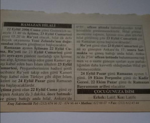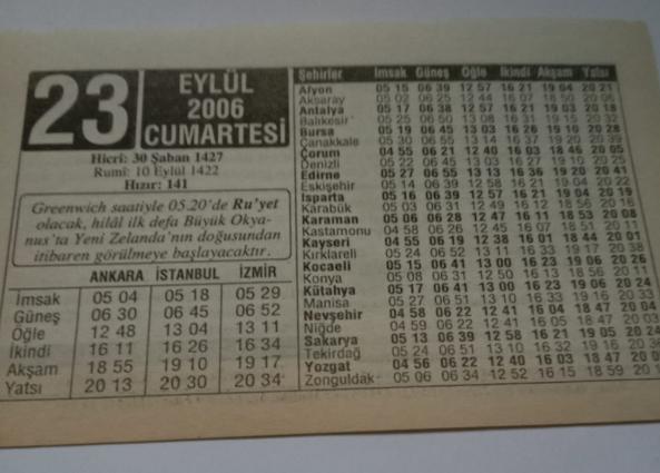 23 Eylül 2006-Orijinal Takvim Yaprağı-Doğum Günü-Söz,Nişan,Nikâh,Düğün ve Önemli Günler Hediyesi-ERAŞ Hizmet Takvimi-Ayet-Hadis(Greenwich Saatiyle 12.27'de Ru'yet Olacak,hilal Yeni Zelanda'nın Doğusundan İtibaren Görülmeye Başlayacaktır)-Ramazan Hilali-Çocuğunuza İsim:Latif,Latife, en son 4 ay önce güncellenmiştir.