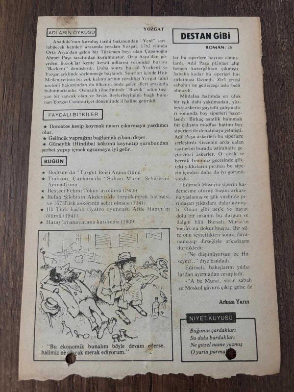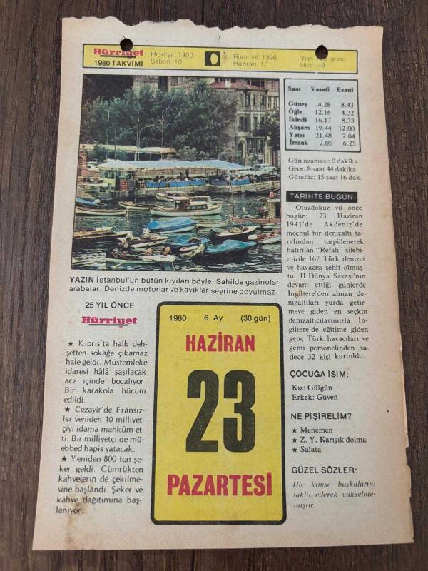 23 HAZİRAN 1980 - TAKVİM YAPRAĞI - DOĞUM GÜNÜ HEDİYESİ - HÜRRİYET TAKVİMİ - DESTAN GİBİ ADLI ROMAN - Bodrum'da "Turgut Reisi Anma Günü' - Besteci Fehmi Tokav'in ölümü (1959) - İlk Türk kadın tiyatro oyuncusu Afife Hanım'ın ölümü (1941) - Hatay'ın anavatana katılması (1939) başlıklı ürün, Efemera, Müzik, Sinema > Belge ve Evraklar > Takvimler kategorisi altında İkinci El olarak satılmaktadır.