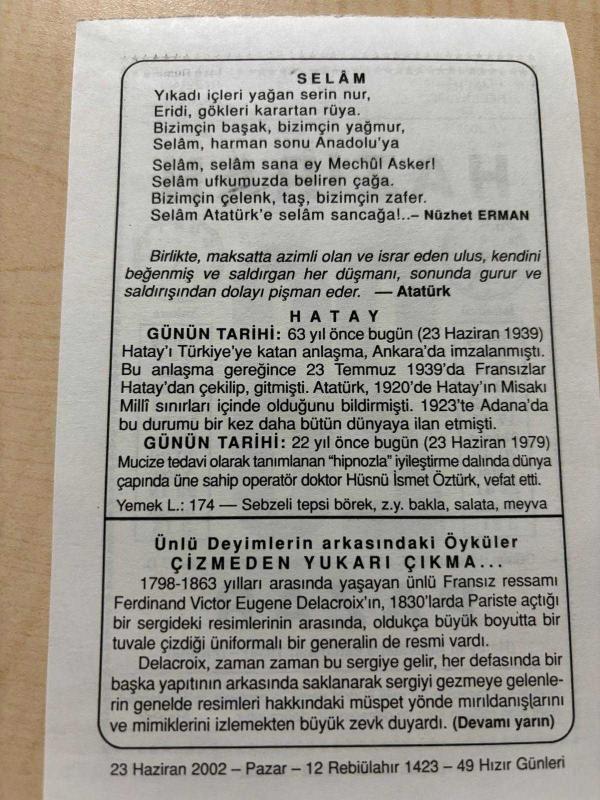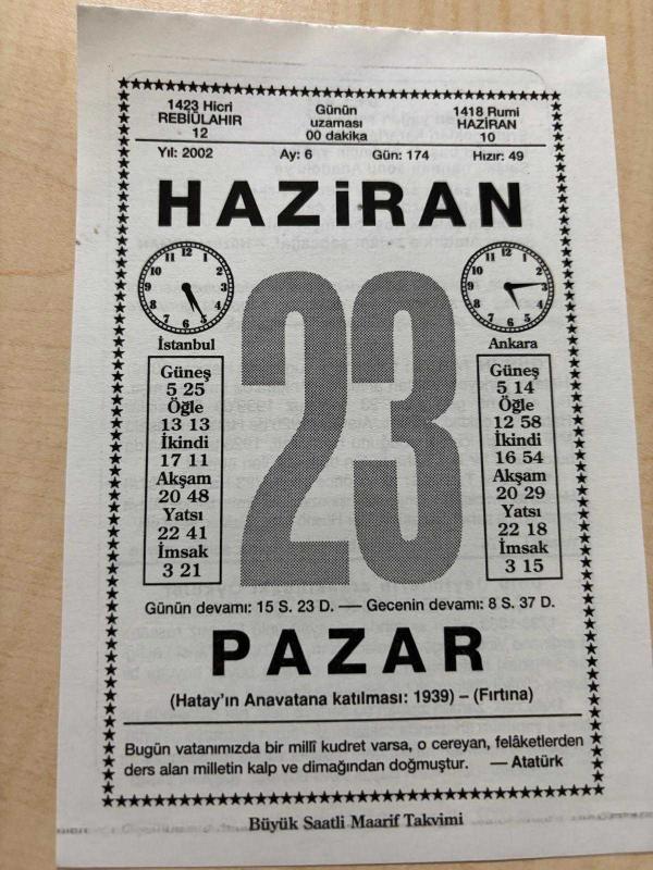 23 HAZİRAN 2002 - TAKVİM YAPRAĞI - DOĞUM GÜNÜ HEDİYESİ - BÜYÜK SAATLİ MAARİF TAKVİMİ - ATATÜRK - NÜZHET ERMAN - HATAY'I TÜRKİYE'YE KATAN ANLAŞMA - OP.DR.HÜSNÜ İSMET ÖTÜRK VEFAT ETTİ - ÇİZMEDEN YUKARI ÇIKMA ADLI YAZI DİZİSİ, en son 8 ay önce güncellenmiştir.