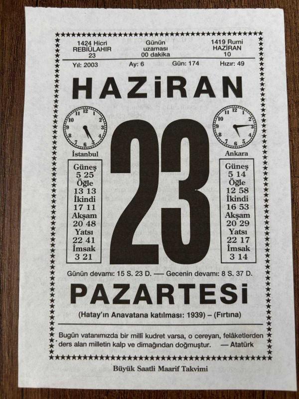 23 HAZİRAN 2003 - TAKVİM YAPRAĞI - DOĞUM GÜNÜ HEDİYESİ - BÜYÜK SAATLİ MAARİF TAKVİMİ - ATATÜRK - HAKKI SUNAT - HATAY'I TÜRKİYE'YE KATAN ANLAŞMA - OP.DR.HÜSNÜ İSMET ÖTÜRK VEFAT ETTİ - BAZILARIMIZ İÇİN MUTLU OLMAK ZOR DEĞİL, 7 ay önce satışa sunulmuştur.