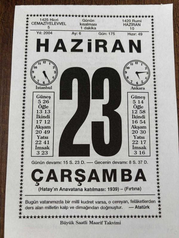 23 HAZİRAN 2004 - TAKVİM YAPRAĞI - DOĞUM GÜNÜ HEDİYESİ - BÜYÜK SAATLİ MAARİF TAKVİMİ - ATATÜRK - HATAY'I TÜRKİYE'YE KATAN ANLAŞMA - OP.DR.HÜSNÜ İSMET ÖTÜRK VEFAT ETTİ - YENGEÇ BURCUNDA DOĞANLAR, en son 8 ay önce güncellenmiştir.