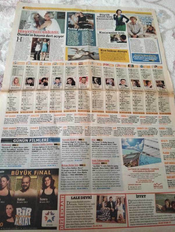 23 Haziran 2012-Akasya durağı-hayri'nin şakası Osman'ın başına dert açıyor-büyük ödülü kim kazanacak-ebru akel-aşıklar yakalanıyor-paris'te gece yarısı-kuşbakışı dünya-arda'nın mutfağı-mazi kalbinde yaradır-alemin kralı-mahmut Tuncer show-komşu kızı-galaksi rehberi-büyük final-yeni bir hayat-günün filmleri-korkusuz-köyden indim şehire-lale devri-bu yaz bir başka güzel-sanat takibi-düşman-türksoyla ipekyolu-çizgi filmler adlı eser, Kitap > Süreli Yayınlar > Gazeteler > Türkiye > Genel > Günlük kategorisinde İkinci El olarak satıştadır.