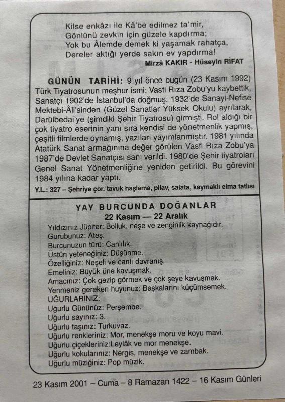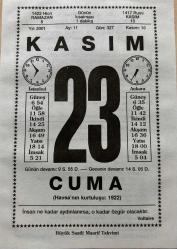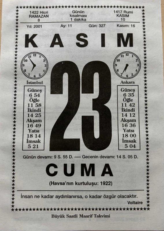 23 KASIM 2001 - TAKVİM YAPRAĞI - DOĞUM GÜNÜ HEDİYESİ - BÜYÜK SAATLİ MAARİF TAKVİMİ - VOLTAİRE - HÜSEYİN RİFAT - TÜRK TİYATROSUNUN MEŞHUR İSMİ VASFİ RIZA ZOBU VEFAT ETTİ - YAY BURCUNDA DOĞANLAR, en son 8 ay önce güncellenmiştir.