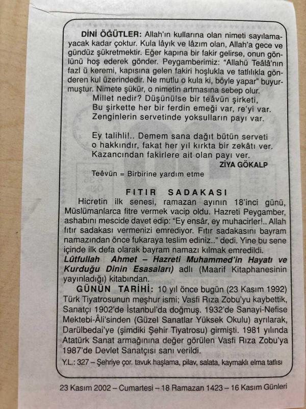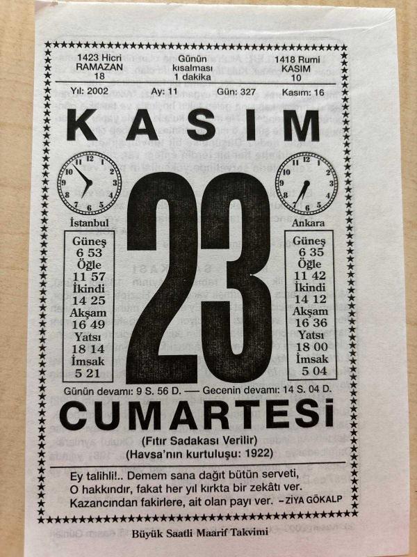 23 KASIM 2002 - TAKVİM YAPRAĞI - DOĞUM GÜNÜ HEDİYESİ - BÜYÜK SAATLİ MAARİF TAKVİMİ - ZİYA GÖKALP - FITIR SADAKASI - TİYATROCU RICA VASFİ ZOBU ÖLDÜ, en son 8 ay önce güncellenmiştir.