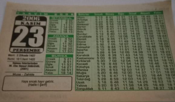 23 Kasım 2006-Orijinal Takvim Yaprağı-Doğum Günü-Söz,Nişan,Nikâh,Düğün ve Önemli Günler Hediyesi-Bizim Anadolu Takvimleri-Ayet(Hadis-i Şerif)-Hamas liderlerinden M.Ebu Hanud öldürüldü(2001)-Musa,Zahide-Tuz, en son 2 ay önce güncellenmiştir.