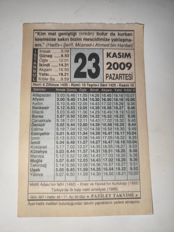 23 Kasım 2009-Orijinal Takvim Yaprağı-Doğum Günü-Söz,Nişan,Nikâh,Düğün ve Önemli Günler Hediyesi-Fazilet Takvimi-Ayet(Hadis)(Hadis-i Şerif, Müsned-i Ahmed Bin Hanbel)-Midilli Adası'nın Fethi (1462)-Kurbanın Fazileti-İbret Gerek İse, en son 3 gün önce güncellenmiştir.