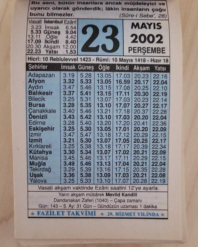 23 MAYIS 2002 PERŞEMBE- TAKVİM YAPRAĞI - DOĞUM GÜNÜ HEDİYESİ - FAZİLET TAKVİMİ -DANDANAKAN ZAFERİ (1040)-VELADET KANDİLİ, en son 6 ay önce güncellenmiştir.