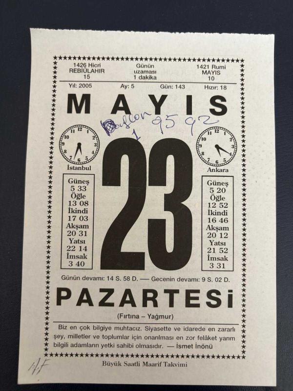 23 MAYIS 2005 - TAKVİM YAPRAĞI - DOĞUM GÜNÜ HEDİYESİ - BÜYÜK SAATLİ MAARİF TAKVİMİ - İSMET İNÖNÜ - ÜMİT YAŞAR - NAZİ LİDERLERİNDEN HİMMLER İNTİHAR ETTİ - A.ŞEHNAZ SOYBAY, 6 ay önce satışa sunulmuştur.