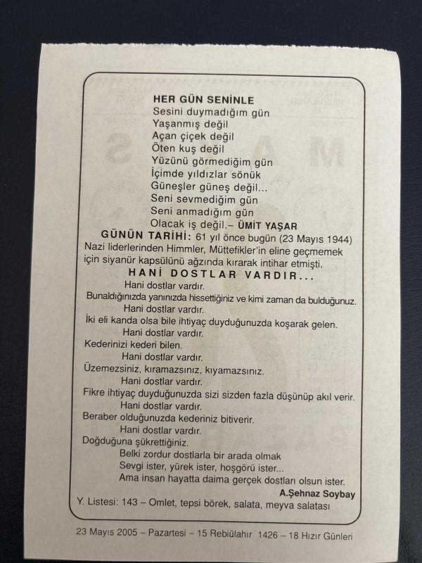 23 MAYIS 2005 - TAKVİM YAPRAĞI - DOĞUM GÜNÜ HEDİYESİ - BÜYÜK SAATLİ MAARİF TAKVİMİ - İSMET İNÖNÜ - ÜMİT YAŞAR - NAZİ LİDERLERİNDEN HİMMLER İNTİHAR ETTİ - A.ŞEHNAZ SOYBAY başlıklı ürün, Efemera, Müzik, Sinema > Belge ve Evraklar > Takvimler kategorisi altında İkinci El olarak satılmaktadır.