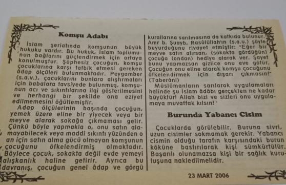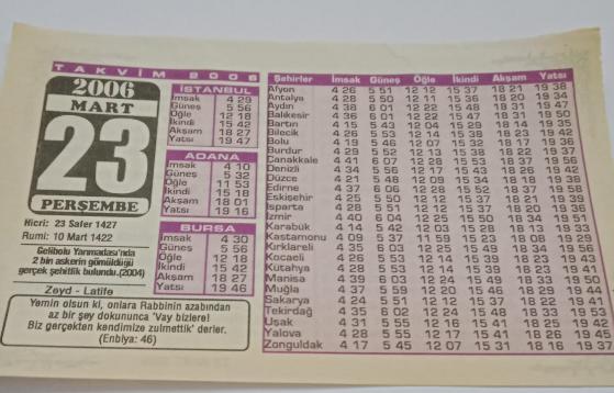 23 Mart 2006-Orijinal Takvim Yaprağı-Doğum Günü-Söz,Nişan,Nikâh,Düğün ve Önemli Günler Hediyesi-Bizim Anadolu Takvimleri-Ayet-Hadis(Enbiya:46)(Gelibolu Yarımadası'nda 2bin askerin gömülü olduğu gerçek şehitlik bulundu(2004))-Zeyd-Latife-Komşu Adabı-Burunda Yabancı Cisim, en son 2 ay önce güncellenmiştir.
