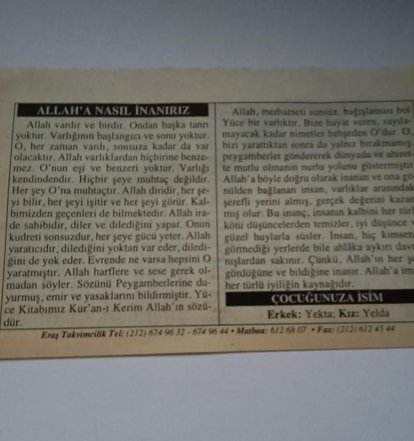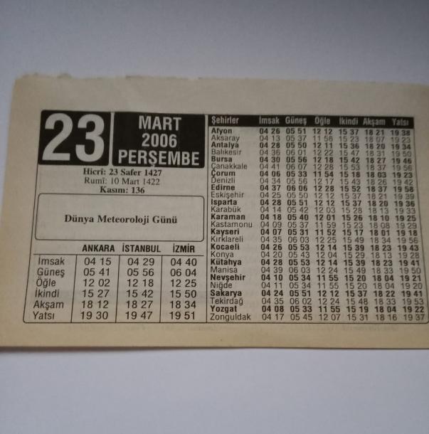 23 Mart 2006-Orijinal Takvim Yaprağı-Doğum Günü-Söz,Nişan,Nikâh,Düğün ve Önemli Günler Hediyesi-ERAŞ Hizmet Takvimi-Ayet-Hadis(Dünya Meteoroloji Günü)-Allah'a Nasıl İnanırız-Çocuğunuza İsim:Yekta;Yelda, en son 3 ay önce güncellenmiştir.