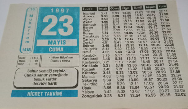 23 Mayıs 1997-Orijinal Takvim Yaprağı-Doğum Günü-Söz,Nişan,Nikâh,Düğün ve Önemli Günler Hediyesi-Hicret Takvimi-Ayet(Hadis)-(Tecrid-i Sarih)-Viktor Hugo'nun Ölümü(1885)-Çarçur Edilen Büyük Miras-Kitaplar-Hikmetler, en son 23 gün önce güncellenmiştir.