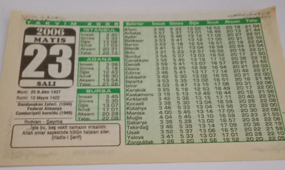 23 Mayıs 2006-Orijinal Takvim Yaprağı-Doğum Günü-Söz,Nişan,Nikâh,Düğün ve Önemli Günler Hediyesi-Bizim Anadolu Takvimleri-Ayet-Hadis(Hadis-i Şerif)(Dandanakan'ın Zaferi(1040))-Rıdvan,Şeyma-Hükm(Yönetim)-I başlıklı ürün, Efemera, Müzik, Sinema > Belge ve Evraklar > Takvimler kategorisi altında İkinci El olarak satılmaktadır.