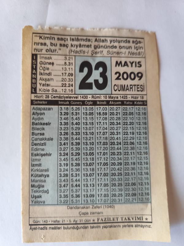 23 Mayıs 2009-Orijinal Takvim Yaprağı-Doğum Günü-Söz,Nişan,Nikâh,Düğün ve Önemli Günler Hediyesi-Fazilet Takvimi-Ayet(Hadis)(Hadis-i Şerif, Sünen-i Nesai)-Dandanakan Zaferi (1040)-Saçın İslam Uğrunda Ağarması başlıklı ürün, Efemera, Müzik, Sinema > Belge ve Evraklar > Takvimler kategorisi altında İkinci El olarak satılmaktadır.