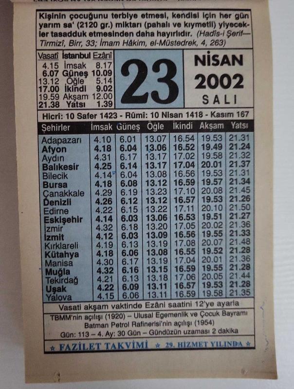 23 NİSAN 2002 SALI- TAKVİM YAPRAĞI - DOĞUM GÜNÜ HEDİYESİ - FAZİLET TAKVİMİ -TBMM'NİN AÇILIŞI (1920)-ULUSAL EGEMENLİK VE ÇOCUK BAYRAMI BATMAN PETROL RAFİNERİSİ'NİN AÇILIŞI (1954)-ÇOCUK TERBİYESİNDE SEVGİ,DİSİPLİN VE İLGİ, en son 7 ay önce güncellenmiştir.