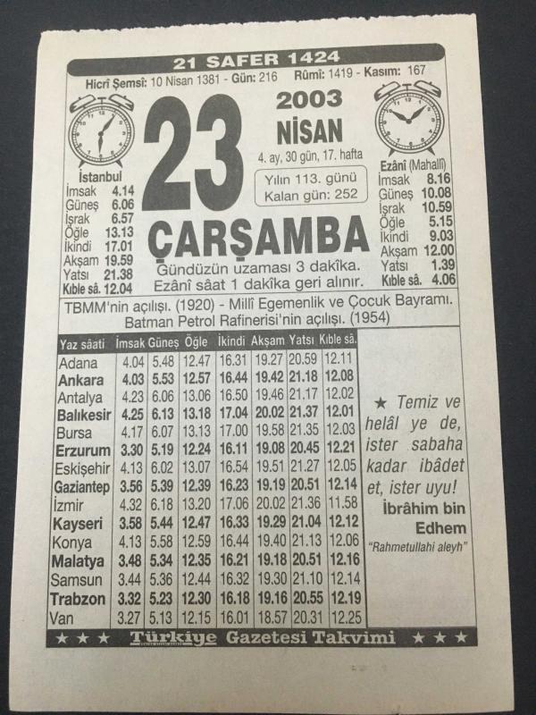 23 NİSAN 2003 -TAKVİM YAPRAĞI-DOĞUM GÜNÜ HEDİYESİ,TÜRKİYE GAZETESİ TAKVİMİ,TBMM NİN AÇILIŞI,1920,MİLLİ EGEMENLİK VE ÇOCUK BAYRAMI,BATMAN PETROL RAFİNESİNİN AÇILIŞI,1954,, en son 8 ay önce güncellenmiştir.