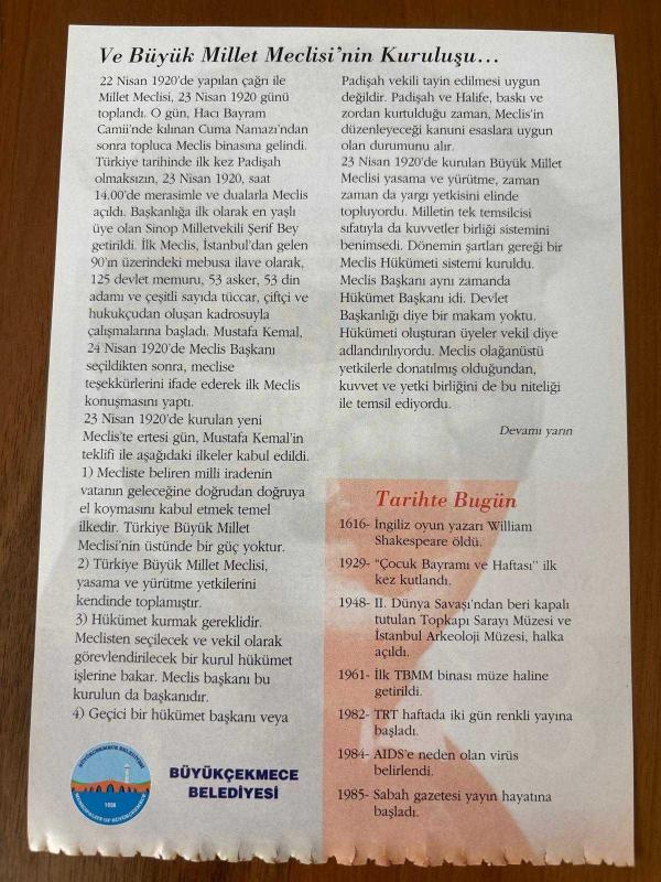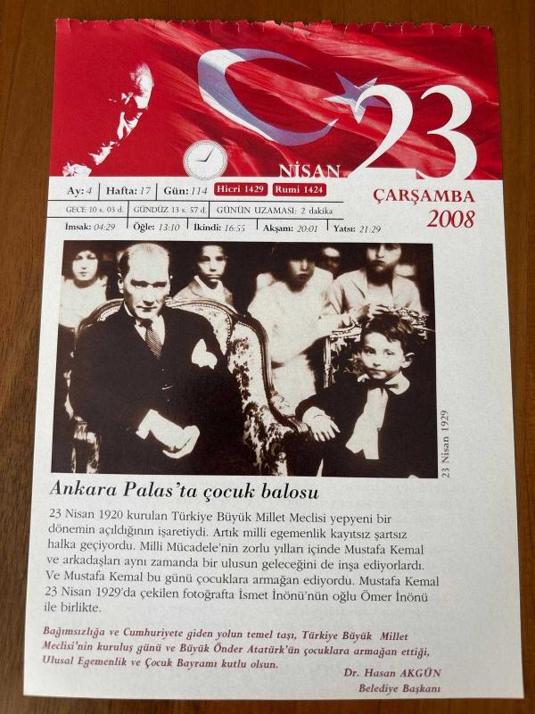 23 NİSAN 2008 - TAKVİM YAPRAĞI - DOĞUM GÜNÜ HEDİYESİ - GAZİ MUSTAFA KEMAL ATATÜRK FOTOĞRAFLI BÜYÜKÇEKMECE BELEDİYESİ TAKVİMİ - Ankara Palas'ta çocuk balosu - Ve Büyük Millet Meclisi'nin Kuruluşu - 1616- İngiliz oyun yazarı William - Shakespeare öldü - 1929- "Çocuk Bayramı ve Haftası" ilk kez kutlandı - 1948- II. Dünya Savaşı'ndan beri kapalı tutulan Topkapı Sarayı Müzesi ve İstanbul Arkeoloji Müzesi, halka açıldı - 1961- İlk TBMM binası müze haline getirildi - 1982- TRT haftada iki gün renkli yayına başladı - 1984- AIDS'e neden olan virüs belirlendi - 1985- Sabah gazetesi yayın hayatına başladı, en son 9 ay önce güncellenmiştir.