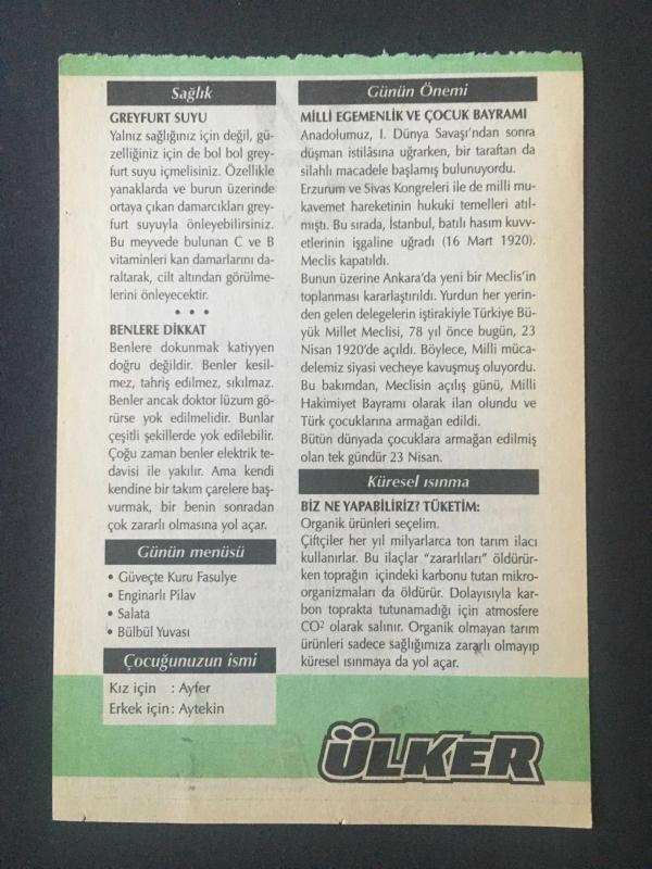 23 NİSAN 2009 -TAKVİM YAPRAĞI-DOĞUM GÜNÜ HEDİYESİ-ÜLKER TAKVİMİ,MİLLİ EGEMENLİK VE ÇOCUK BAYRAMI,TBMM NİN AÇILIŞI 1920,DÜNYA ÇOCUK GÜNÜ,GREYFURT SUYU,ÇOCUĞUNUZUN İSMİ,BİZ NE YAPABİLİRİZ TÜKETİM, en son 8 ay önce güncellenmiştir.