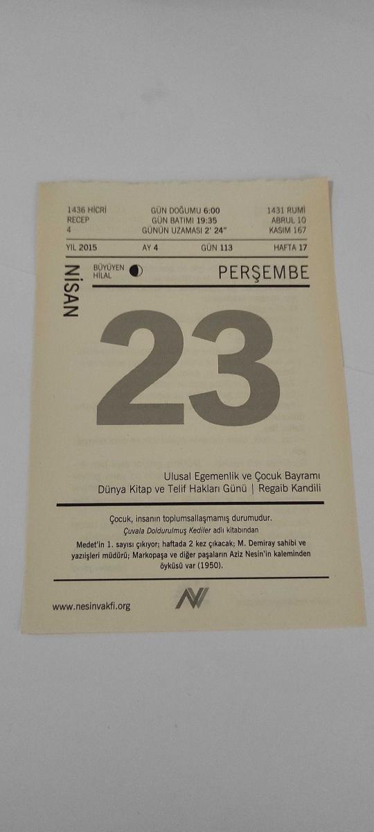 23 Nisan 2015-Orijinal Takvim Yaprağı-Doğum Günü-Söz,Nişan,Nikâh,Düğün ve Önemli Günler Hediyesi-Nesin Vakfı Takvimi-Medet'in 1. sayısı çıkıyor, haftada 2 kez çıkacak, M. Demiray sahibi ve yazıişleri müdürü, Markopaşa ve diğer paşaların Aziz Nesin'in kaleminden öyküsü var (1950)..-Bizim Apartmanın Sahibi-Aziz Nesin'in Damda Deli Var adlı kitabından., en son dün güncellenmiştir.