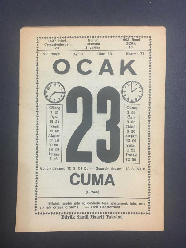23 OCAK 1987 -TAKVİM YAPRAĞI-DOĞUM GÜNÜ HEDİYESİ-BÜYÜK SAATLİ MAARİF TAKVİMİ,FIRTINA,HEY BANA BAKİ,EVİM,KOVA BURCUNDA DOĞANLARIN TALİHİ,FAYDALİ BİLGİLER,MUTLULUK ÇIKMAZINDAN PARÇALAR, 1 yıl önce satışa sunulmuştur.
