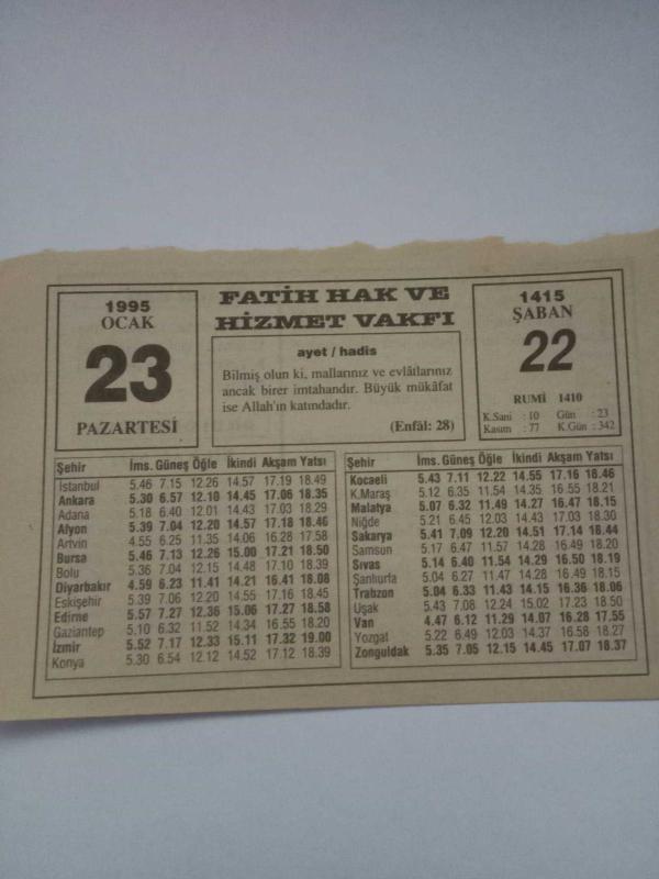 23 Ocak 1995-Orijinal Takvim Yaprağı-Doğum Günü-Söz,Nişan,Nikâh,Düğün ve Önemli Günler Hediyesi-Fatih Hak ve Hizmet Vakfı-Ayet/Hadis(Enfâl:28)-Duanın Efdali-Sözün Özü-Birkaç Not başlıklı ürün, Efemera, Müzik, Sinema > Belge ve Evraklar > Takvimler kategorisi altında İkinci El olarak satılmaktadır.