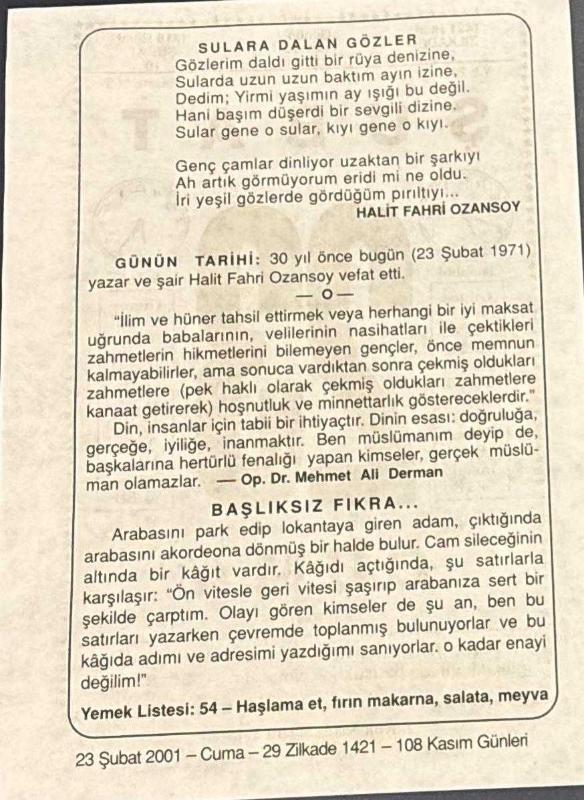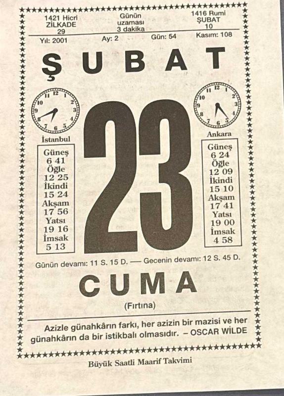 23 ŞUBAT 2001 - TAKVİM YAPRAĞI - DOĞUM GÜNÜ HEDİYESİ - BÜYÜK SAATLİ MAARİF TAKVİMİ - OSCAR WİLDE - HALİT FAHRİ OZANSOY - OP.DR. MEHMET ALİ DERMAN - BAŞLIKSIZ FIKRA, en son 8 ay önce güncellenmiştir.