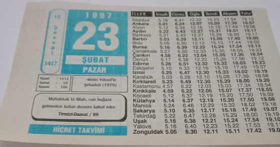 23 Şubat 1997-Orijinal Takvim Yaprağı-Doğum Günü-Söz,Nişan,Nikâh,Düğün ve Önemli Günler Hediyesi-Hicret Takvimi-Ayet(Hadis)-(Tİrmizi/Daavat/99)-Metin Yüksel'in Şehadeti(1979)-Metin Yüksel-Teşrik Tekbiri, en son 23 gün önce güncellenmiştir.