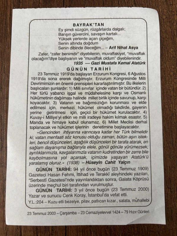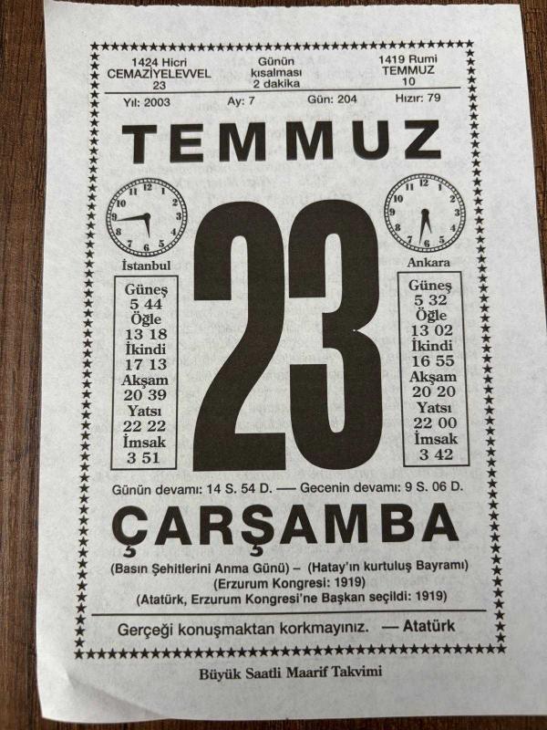 23 TEMMUZ 2003 - TAKVİM YAPRAĞI - DOĞUM GÜNÜ HEDİYESİ - BÜYÜK SAATLİ MAARİF TAKVİMİ - ATATÜRK - ARİF NİHAT ASYA - GAZİ MUSTAFA KEMAL ATATÜRK - HÜSEYİN CAHİT YALÇIN - GAZETECİ HASAN FEHMİ'NİN VURULMASI - YAZAR VE SUNUCU CENK KORAY'IN VEFATI, en son 8 ay önce güncellenmiştir.