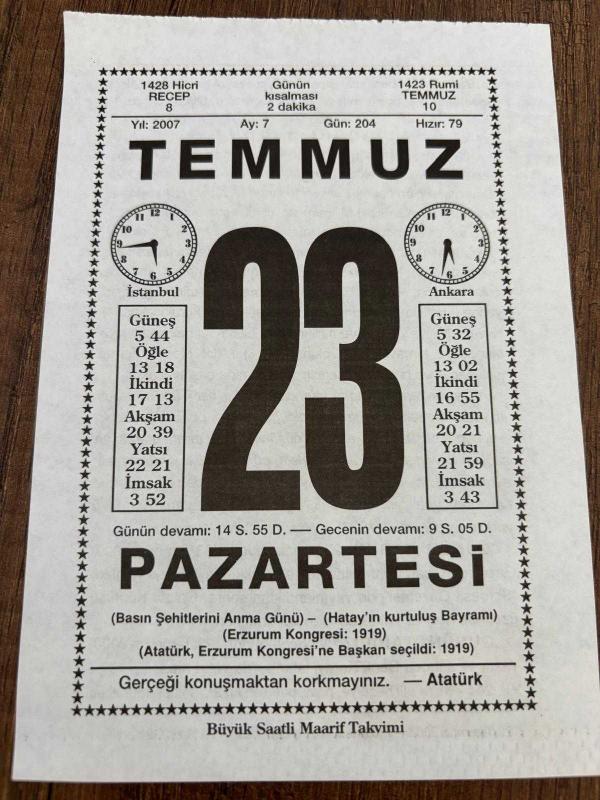 23 TEMMUZ 2007 - TAKVİM YAPRAĞI - DOĞUM GÜNÜ HEDİYESİ - BÜYÜK SAATLİ MAARİF TAKVİMİ - ATATÜRK - GAZİ MUSTAFA KEMAL ATATÜRK - HÜSEYİN CAHİT YALÇIN - GAZETECİ HASAN FEHMİ'NİN VURULMASI - YAZAR VE SUNUCU CENK KORAY'IN VEFATI, en son 8 ay önce güncellenmiştir.