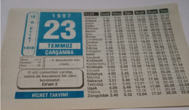 23 Temmuz 1997-Orijinal Takvim Yaprağı-Doğum Günü-Söz,Nişan,Nikâh,Düğün ve Önemli Günler Hediyesi-Hicret Takvimi-Ayet(Hadis)-(Hadis)-(En'am 2)-II.Meşrutiyet'in İlanı (1908)-İş İşten Geçerse-Peygamberimiz(SAV)-Z.Ömer Efendi başlıklı ürün, Efemera, Müzik, Sinema > Belge ve Evraklar > Takvimler kategorisi altında İkinci El olarak satılmaktadır.