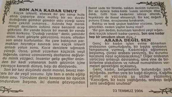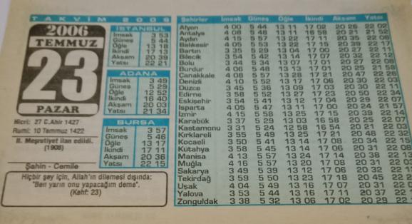 23 Temmuz 2006-Orijinal Takvim Yaprağı-Doğum Günü-Söz,Nişan,Nikâh,Düğün ve Önemli Günler Hediyesi-Bizim Anadolu Takvimleri-Ayet(Kehf: 23)-(Il. Meşrutiyet ilan edildi. (1908))-Şahin - Cemile-Son Ana Kadar Umut-Araba Değil Sen başlıklı ürün, Efemera, Müzik, Sinema > Belge ve Evraklar > Takvimler kategorisi altında İkinci El olarak satılmaktadır.