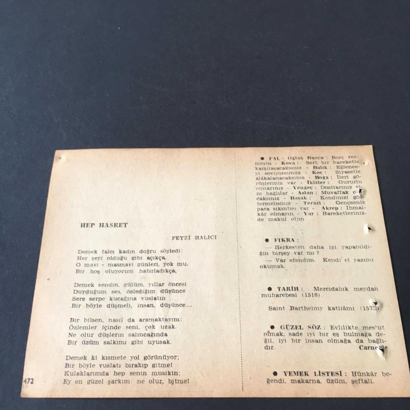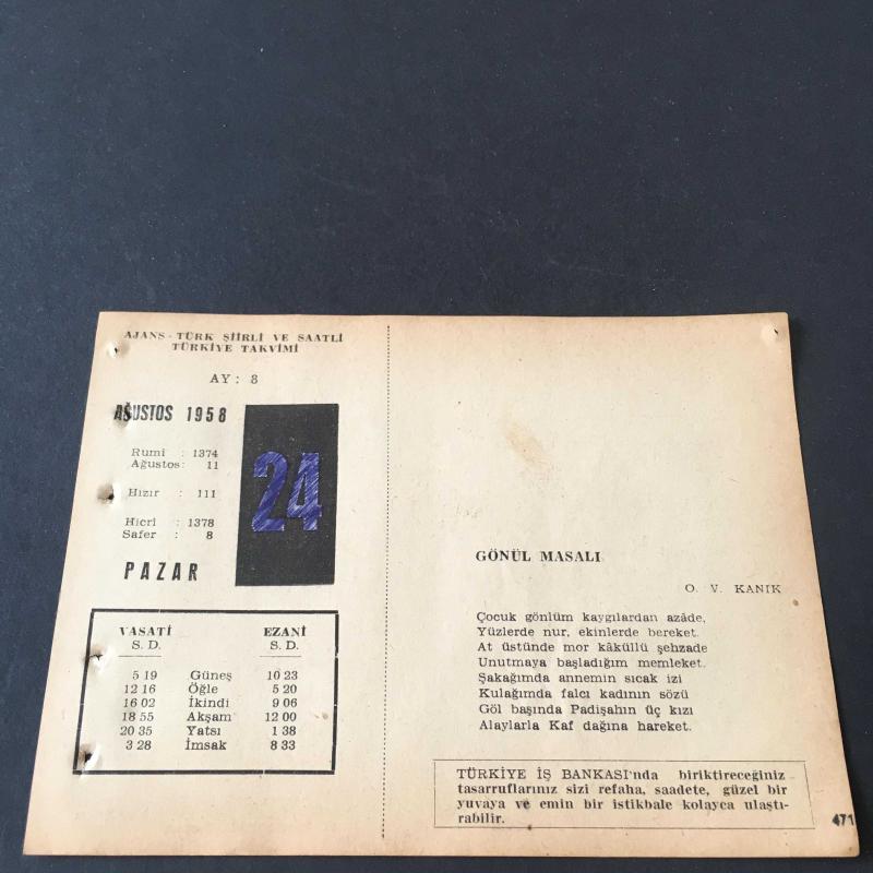 24 AĞUSTOS 1958 -TAKVİM YAPRAĞI-DOĞUM GÜNÜ HEDİYESİ-AJANS-TÜRK ŞİİRLİ VE SAATLİ TÜRKİYE TAKVİMİ,O.V.KANIK,FEYZİ HALICI,FAL,FIKRA,MERCİDABIK SAVAŞI 1516,SAİNT BARTHELMY KATLİAMI 1572,GÜZEL SÖZ,YEMEK LİSTESİ başlıklı ürün, Efemera, Müzik, Sinema > Belge ve Evraklar > Takvimler kategorisi altında İkinci El olarak satılmaktadır.
