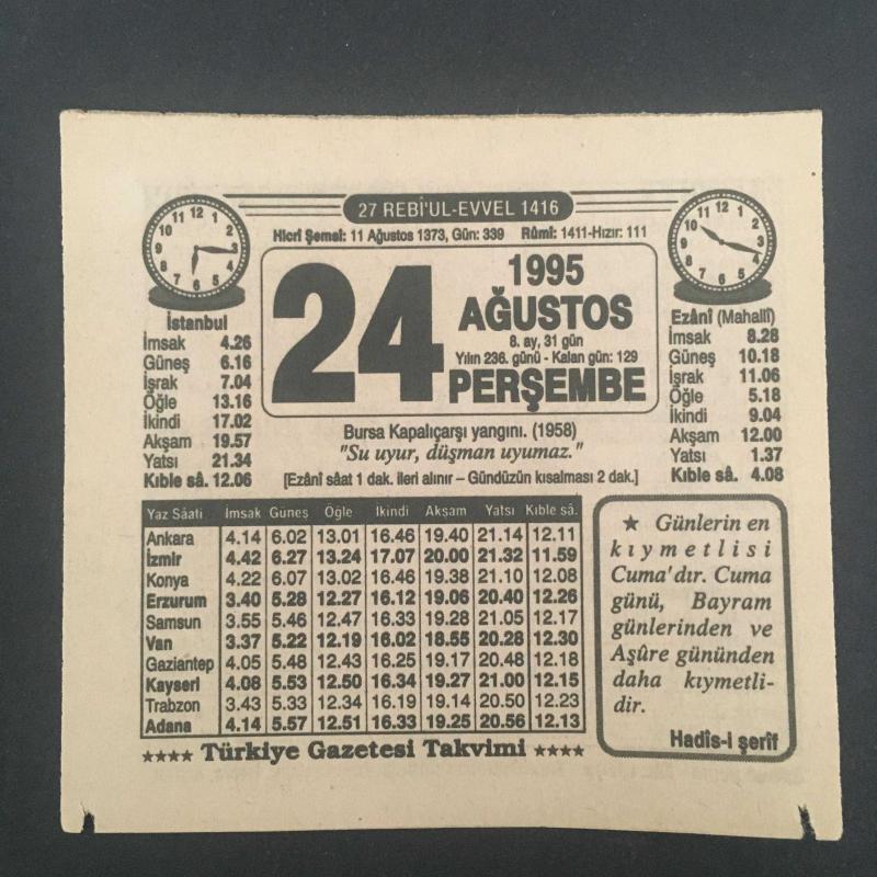 24 AĞUSTOS 1995 -TAKVİM YAPRAĞI-DOĞUM GÜNÜ HEDİYESİ-TÜRKİYE GAZETESİ TAKVİMİ,BURSA KAPALIÇARŞI YANGINI 1958,BABAM,HOŞGÖRÜ, en son 8 ay önce güncellenmiştir.