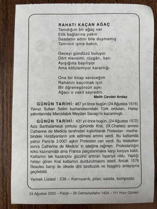 24 AĞUSTOS 2003 - TAKVİM YAPRAĞI - DOĞUM GÜNÜ HEDİYESİ - BÜYÜK SAATLİ MAARİF TAKVİMİ - MEHMET CEVDET ANDAY - PARİS PROTESTAN KATLİAMI - YAVUZ SULTAN SELİM MERCİDABIK ZAFERİ, en son 8 ay önce güncellenmiştir.